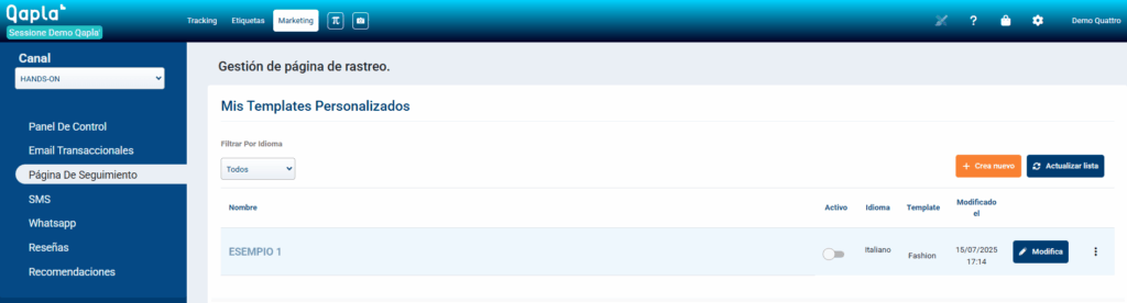 • Una vez guardados los templates para los idiomas deseados, vuelve a Gestión de la Página de Tracking.