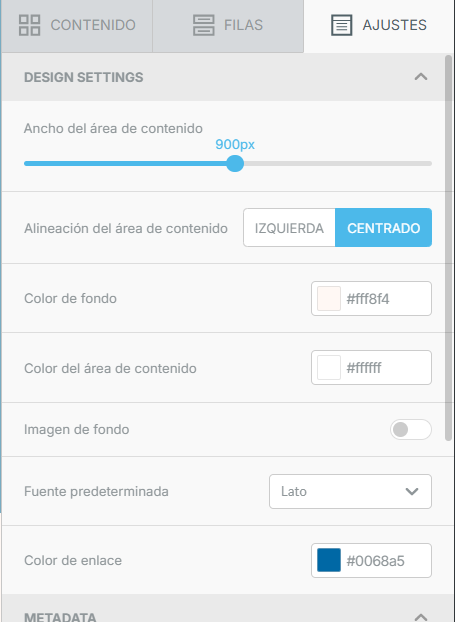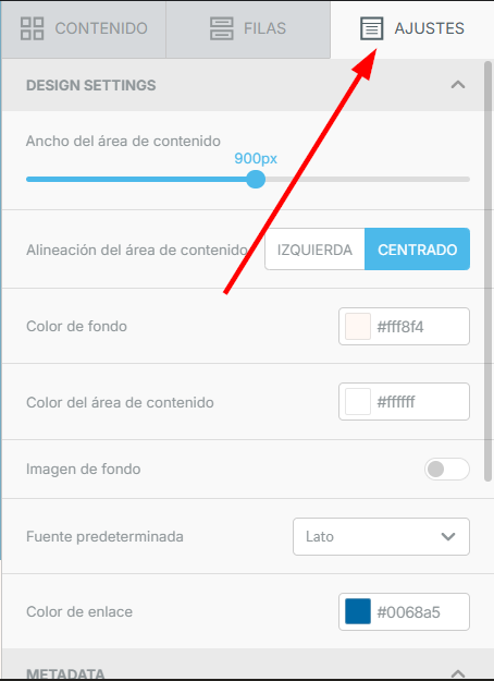 • En la pestaña «Ajustes» a la derecha, define el ancho del cuerpo, el color de fondo, las tipografías y los colores de los enlaces.