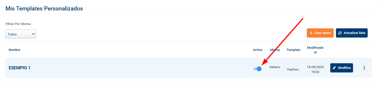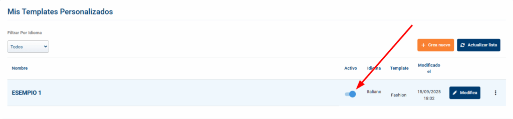 • Activa los interruptores de los templates que quieras publicar. Recuerda: solo un template activo por idioma.